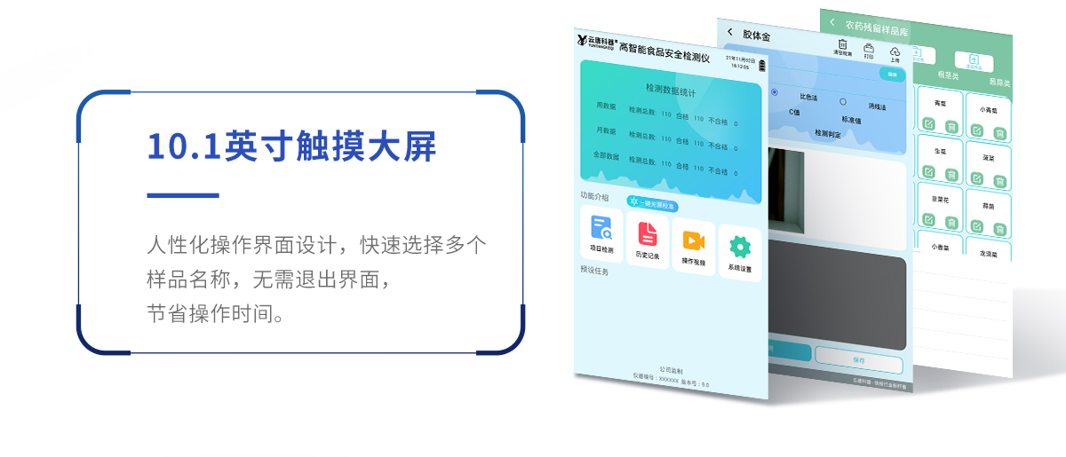 山東云唐智能科技有限公司生產的高智能食品安全檢測儀可快速檢測200多種食品安全項目,包含非食用化學物質、濫用食品添加劑、農藥殘留、獸藥殘留、重金屬、病害肉、營養(yǎng)強化劑、抗生素類殘留、激素類殘留、真菌毒素類殘留、化學類殘留等項目的定性定量檢測。