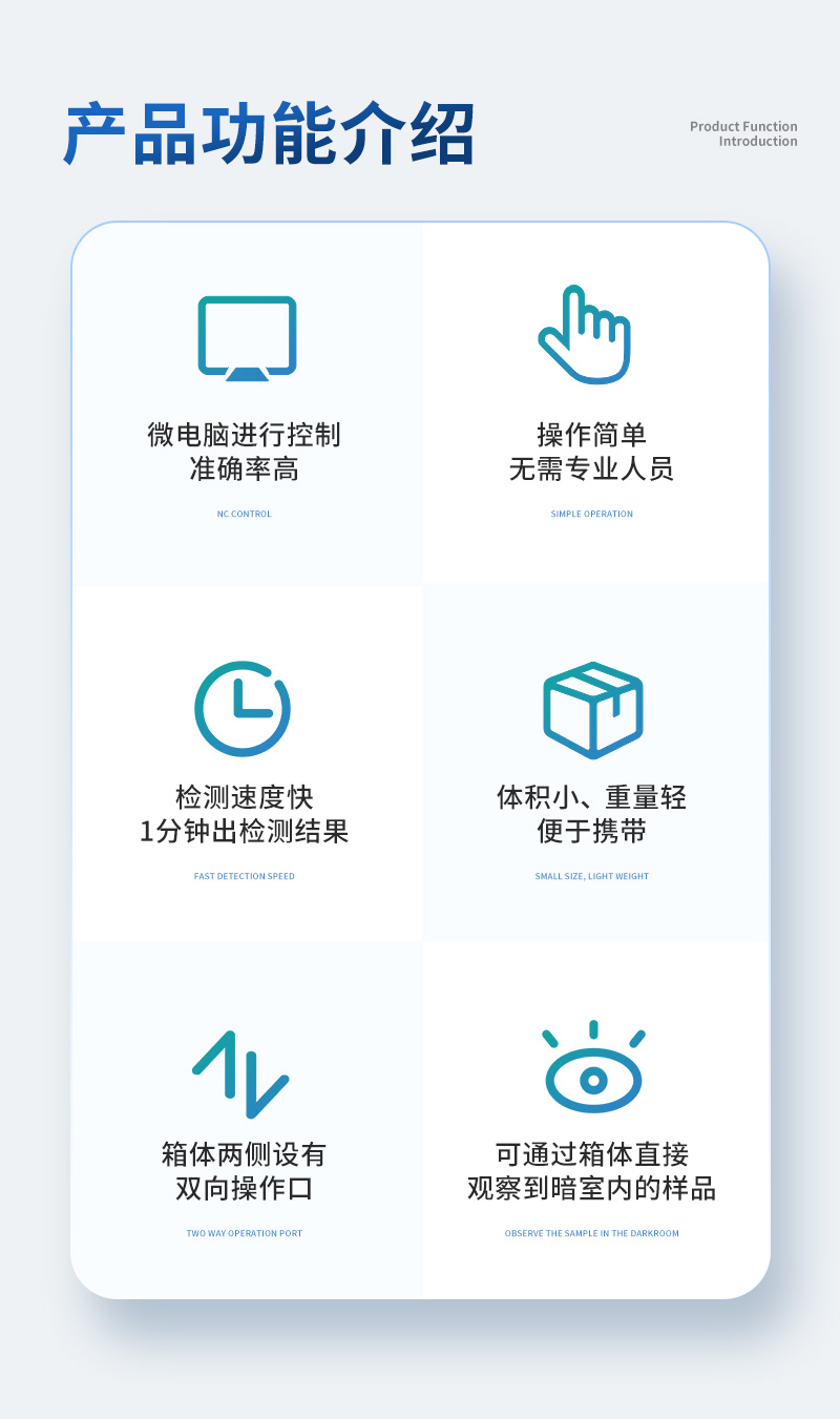 | ★1、采用微電腦進行控制,準確率高 | ★2、操作簡單,無需專業(yè)人員 | ★3、檢測速度快,1分鐘出檢測結果 | ★4、體積小、重量輕、便于攜帶 |