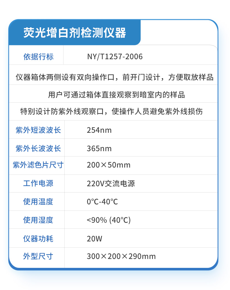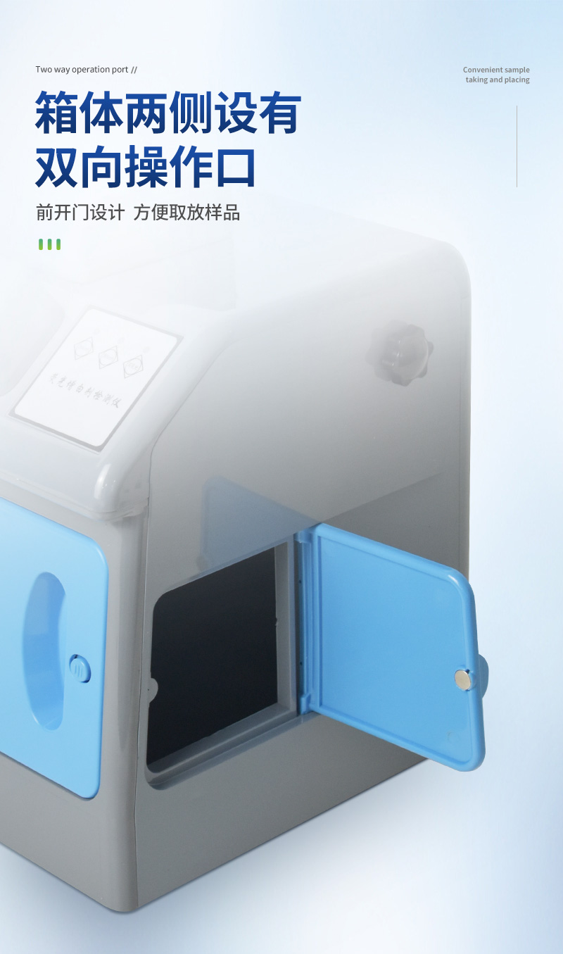 | ★依據行標:NY/T1257-2006 | ★儀器箱體兩側設有雙向操作口,前開門設計,方便取放樣品。 | ★用戶可通過箱體直接觀察到暗室內的樣品。 | ★特別設計防紫外線觀察口,使操作人員避免紫外線損傷。 | ★紫外短波波長:254nm | ★紫外長波波長:365nm | ★可見光源 | ★紫外濾色片尺寸:200×50mm | ★工作電源: 220V交流電源 | ★使用溫度: 0℃-40℃ | ★使用濕度:<90% (40℃) | ★儀器功耗: 20W | ★外型尺寸:300×200×290mm |