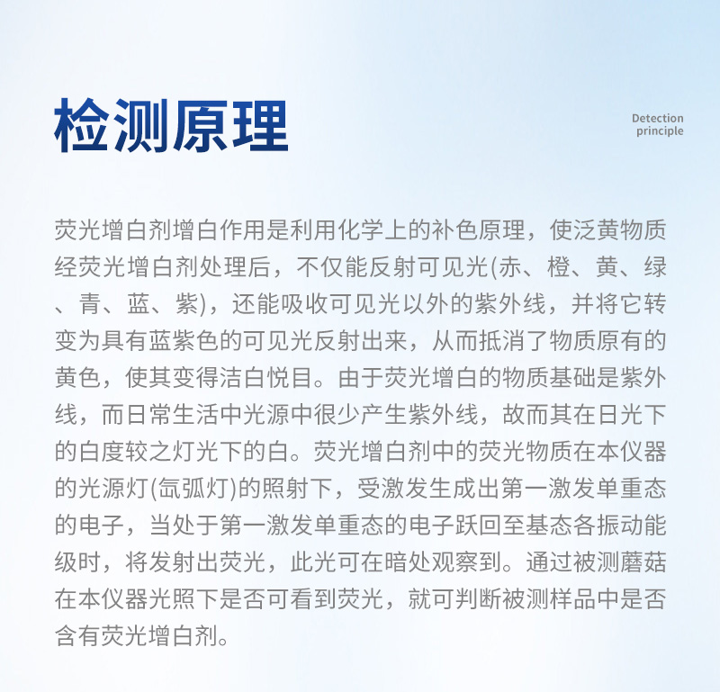 | 熒光增白劑增白作用是利用化學上的補色原理,使泛黃物質經熒光增白劑處理后,不僅能反射可見光(赤、橙、黃、綠、青、藍、紫),還能吸收可見光以外的紫外線,并將它轉變?yōu)榫哂兴{紫色的可見光反射出來,從而抵消了物質原有的黃色,使其變得潔白悅目。由于熒光增白的物質基礎是紫外線,而日常生活中光源中很少產生紫外線,故而其在日光下的白度較之燈光下的白。熒光增白劑中的熒光物質在本儀器的光源燈(氙弧燈)的照射下,受激發(fā)生成出第一激發(fā)單重態(tài)的電子,當處于第一激發(fā)單重態(tài)的電子躍回至基態(tài)各振動能級時,將發(fā)射出熒光,此光可在暗處觀察到。通過被測蘑菇在本儀器光照下是否可看到熒光,就可判斷被測樣品中是否含有熒光增白劑。 |
