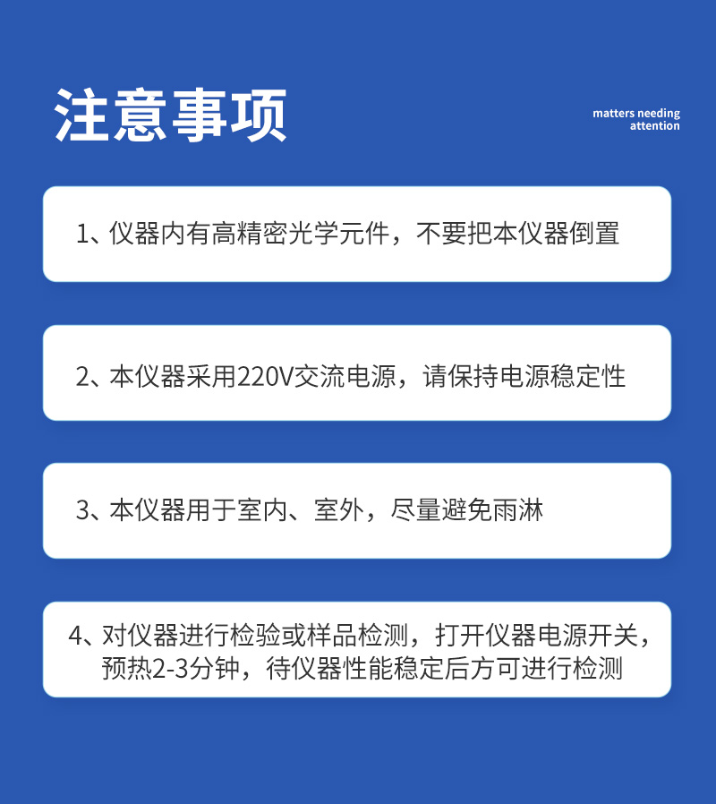 | 1. 儀器內有高精密光學元件,不要把本儀器倒置 | 2. 本儀器采用220V交流電源,請保持電源穩(wěn)定性 | 3. 本儀器用于室內、室外,盡量避免雨淋 | 4. 對儀器進行檢驗或樣品檢測,打開儀器電源開關,需預熱2-3分鐘,待儀器性能穩(wěn)定后方可進行檢測 |