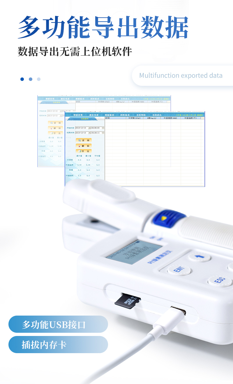 5.多功能USB接口,可實現數據導出與充電功能,可將儀器與電腦直接聯機,數據導出無需上位機軟件,還可選擇使用內存卡直接導出數據,操作簡單方便