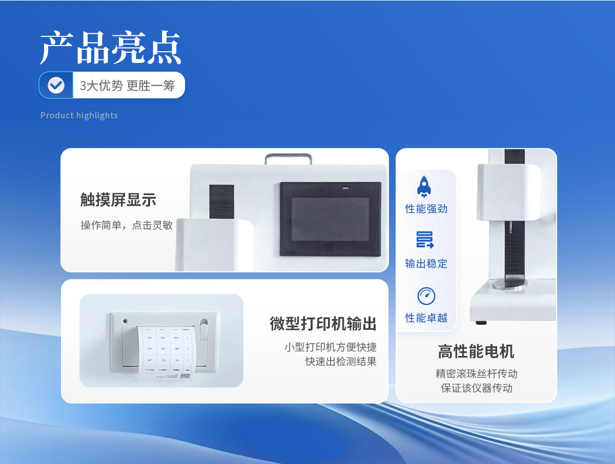 1、采用芯片控制,高精度測力傳感器,精度高。 | 2、采用高性能電機,滾珠絲桿傳動,保證該儀器傳動。 | 3、大觸摸屏中文顯示,友好人機界面操作。全自動完成測試。操作方便,具有測試數(shù)據(jù)統(tǒng)計處理功能,微型打印機輸出。 |