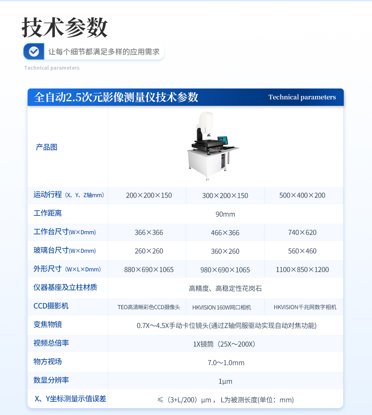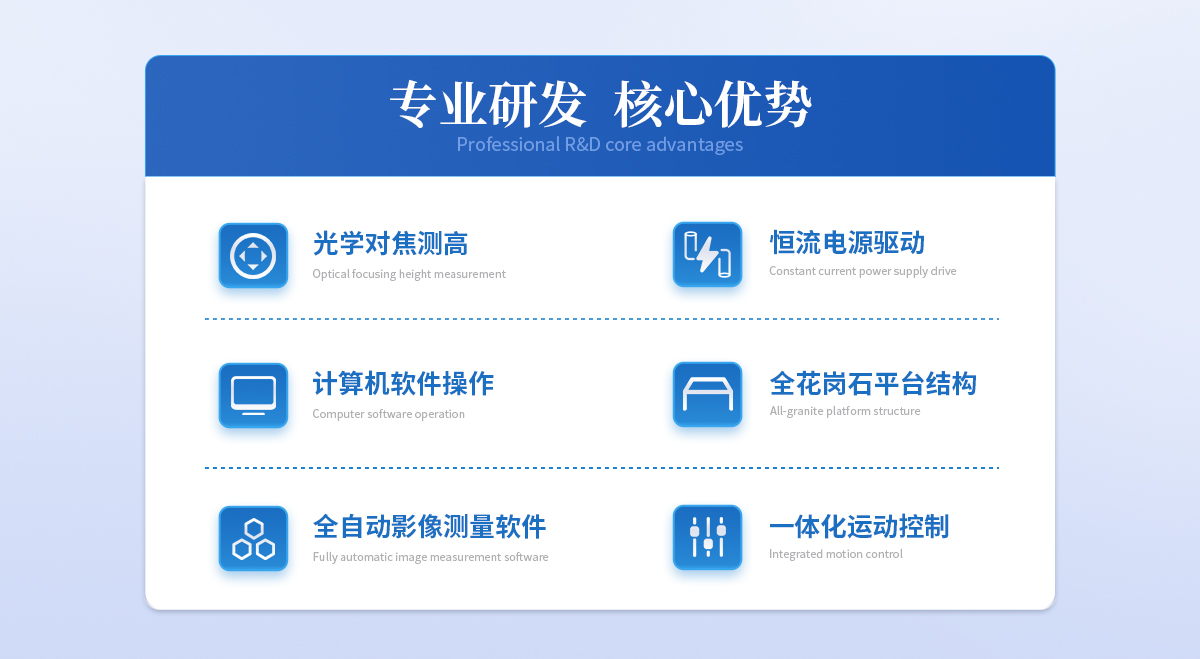 | 儀器基座 精磨高精度高穩(wěn)定性硬質(zhì)鑄鋁 1套 | CCD 700TVL模擬信號高清彩色CCD(COMST) 1個 | 鏡頭 0.7~4.5 X連續(xù)變焦鏡頭 1個 | 光柵尺 高精度位移傳感電子尺,分辨率:1μm (精微) 2條 | 導(dǎo)軌 咸陽藍(lán)博P級精密交叉導(dǎo)軌(LB) 3組 | 傳動 西德無牙光桿精密傳動(西德) 3條 | 表面光源 LED恒流環(huán)形驅(qū)動光源 (兩環(huán)一區(qū)) 1個 | 底光源 LED白色恒流底光源 1PCS | 數(shù)據(jù)采集卡 DC3000 1PCS | 視頻采集卡 視頻采集卡 1PCS | 影像測量軟件 DTV 2.5T手動影像測量軟件 1套 | 光學(xué)校正片 DTV 定制 1塊 | 電壓 AC :100-240V(全電壓) 1個 |