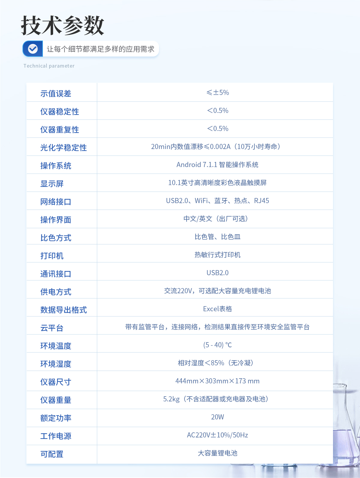 示值誤差:≤±5%; | 儀器穩定性:<0.5%; | 儀器重復性:<0.5%; | 光化學穩定性:20min內數值漂移≤0.002A(10萬小時壽命); | 檢測量程:0.004-0.05mg/L; | 檢測下限:0.004mg/L; | 分辨率:0.001mg/L; | 比色方式:支持10mm、30mm、40mm、50mm皿比色和φ16mm管比色等比色方式 | 操作系統:Android7.1.1智能操作系統; | 操作界面:中文或英文操作界面; | 顯示屏:10.1英寸高清晰度彩色液晶觸摸屏; | 網絡接口:USB2.0、HDMI、WiFi、藍牙、熱點、RJ45; | 云平臺:儀器帶有監管平臺,連接有線/無線網絡,檢測結果直接傳輸至環境安全監管平臺; | 打印機:熱敏行式打印機; | 數據儲存:800萬組,可自由調用查看; | 數據導出格式:Excel表格; | 儀器尺寸:367x243x125mm; | 儀器重量:5.3kg; | 環境溫度:(5-40)℃; | 環境濕度:相對濕度<85%(無冷凝); | 額定功率:10W; | 工作電源:AC220V±10%/50Hz; | 可配置:大容量鋰電池。 |