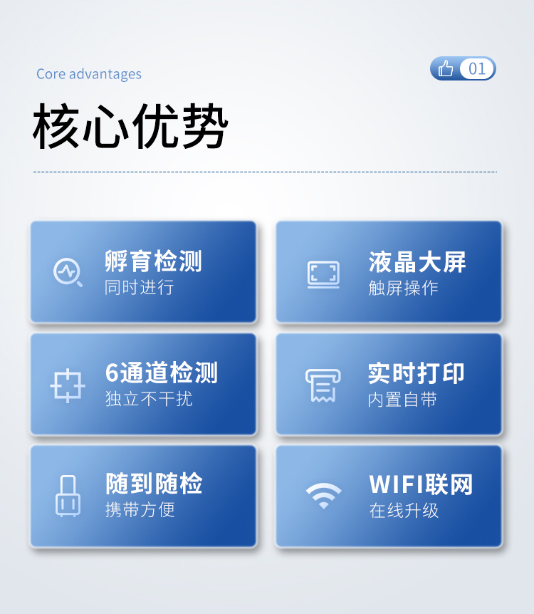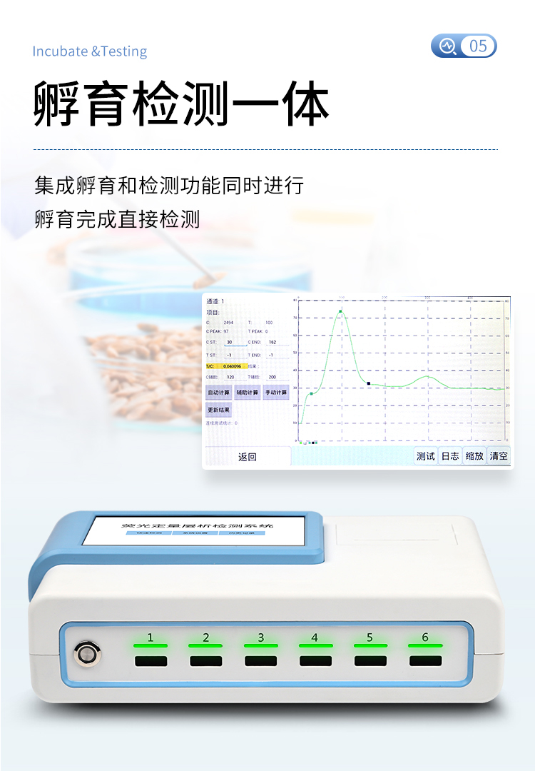 5、6通道設計,可同時進行一種或多種指標的檢測,6個獨立檢測單元,檢測效率高,并且互不干擾;