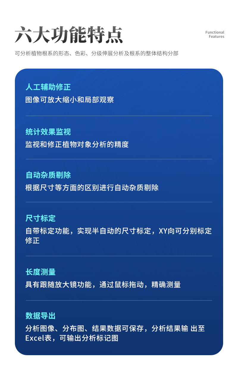 | 1:根總長、根平均直徑、根總體積、根尖計數、分叉計數、交疊計數、根直徑等級分布參數、根尖段長分布。 | 2:可不等間距地自定義分段直徑,自動測量各直徑段長度、投影面積、表面積、體積 等,及其分布參數。 | 3:能進行根系的顏色分析,確定出根系存活數量,輸出不同顏色根系的直徑、長度、投影面積、表面積、體積。 | 4:能進行根系的拓撲分析,自動確定根的連接數、關系角等,還能單獨地自動分析主根或任意一支側根的長度和分叉數等,可單獨顯示標記根系的任意直徑段相應各參數(分檔數、檔直徑范圍任意可改,可不等間距地自定義),并能進行根的分叉裁剪、合并、連接等修正,修正操作能回退,以快速獲得100%正確的結果。 | 5:精度根長≤±1%、面積在優質圖像質量時<1%、標準圖像時≤3%。 | 6:分析圖像、分布圖、結果數據可保存,分析結果輸出至Excel表,可輸出分析標記圖。 |
