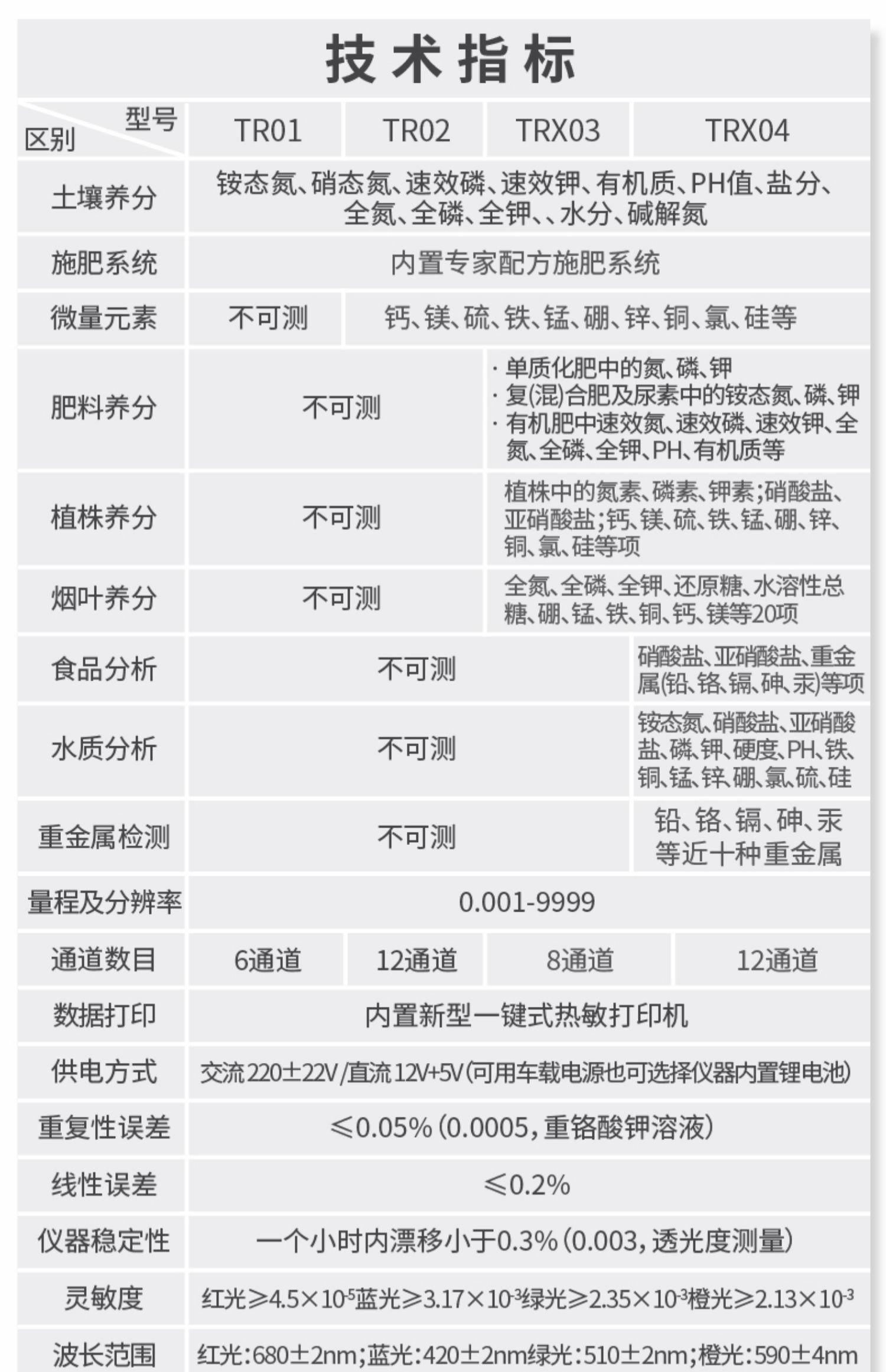 | 電源:交流電:180V~240V、50赫茲;直流電:12V(可接車載電源) | 量程及分辨率:0.001-9999 | 穩(wěn)定性:三分鐘內(nèi)漂移小于0.003 | 線性誤差:小于0.003 | 重復(fù)性誤差:小于0.005 | 靈敏度:紅光≥4.5 ×10-5 綠光≥3.57×10-3 | 波長范圍:紅光620±8nm 綠光510±8nm | 測試速度:測一個植株樣(N、P、K)≤40分鐘(含前處理時間) | 數(shù)據(jù)打印:內(nèi)置高檔一鍵式熱敏打印機 |